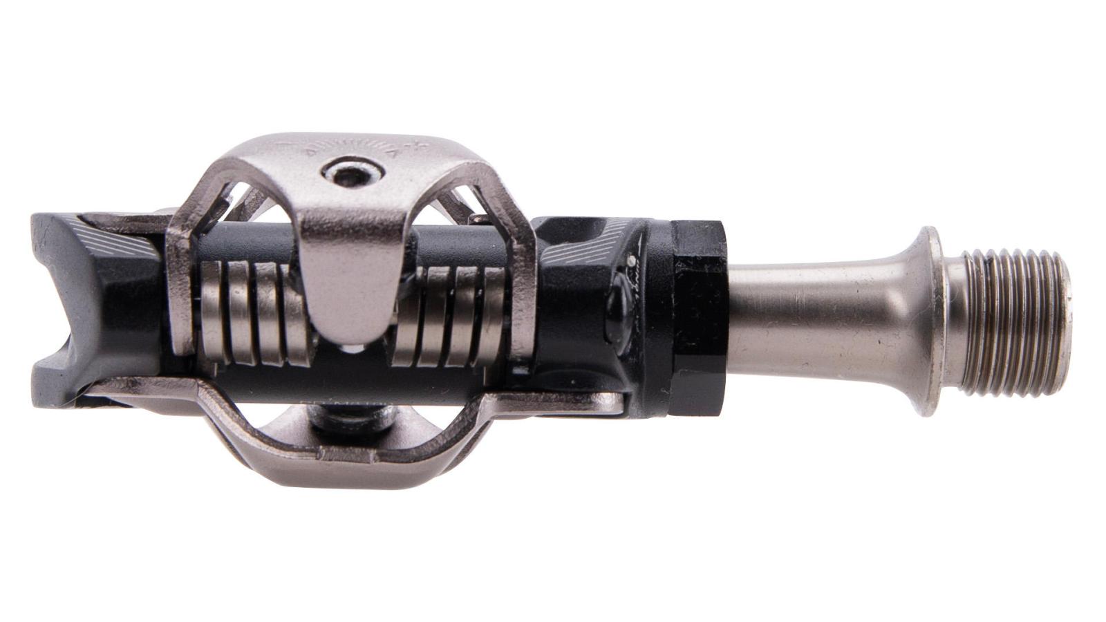 MTB, Aluminiumkörper, offener Mechanismus wirkt Verschlammungen entgegen, stabile, langlebige CrMo-Achse mit stirnseitigem Innensechskantansatz (8 mm), verbesserter Eingriff der Schuhplatten für höhere Trittstabilität, einstellbare Auslösehärte, wartungsarme, gedichtete Kompaktlagereinheit, ohne Reflektor
